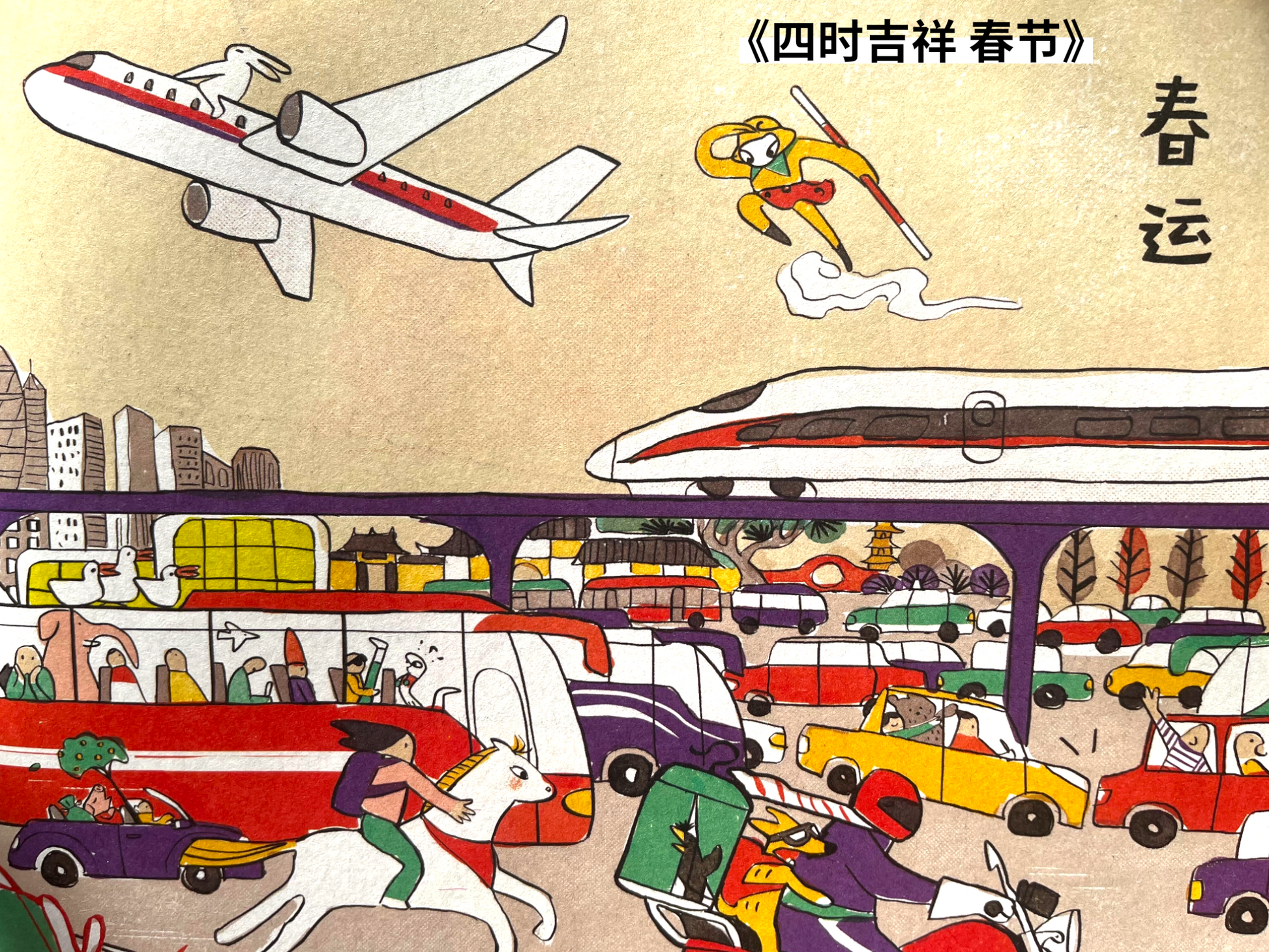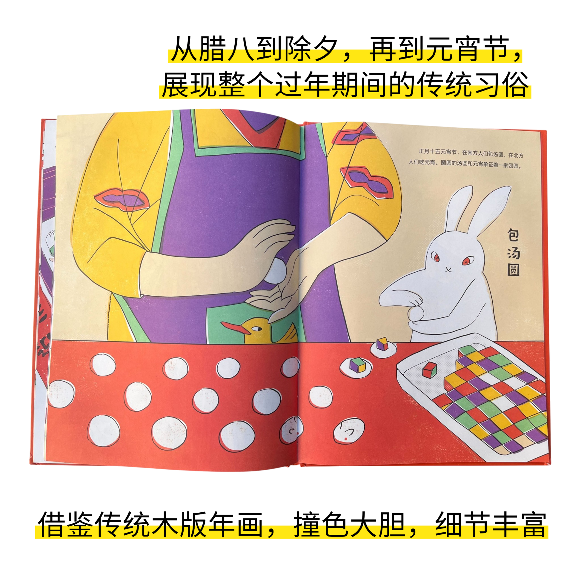 展现从腊八到元宵的春节全程习俗,喝腊八粥、赶春运、打年糕、贴年红、包饺子、吃汤圆…… 画面借鉴传统年画工艺,细节丰富,将十二生肖、灶王爷等传统文化元素融入现代场景,配色大胆,画风古老又时尚,画面充满可解读的文化细节。